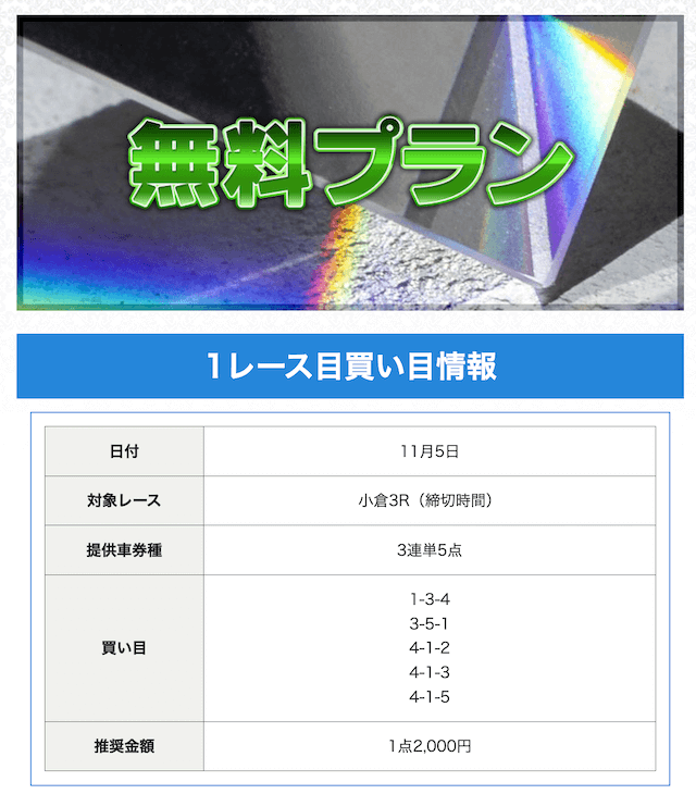 | 戦績 | 5戦4勝1敗 | 的中率 | 80% | 回収率 | 103.2% |