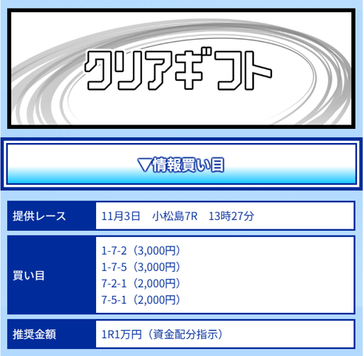 | 戦績 | 12戦9勝3敗 | 的中率 | 75% | 回収率 | 319.2% |