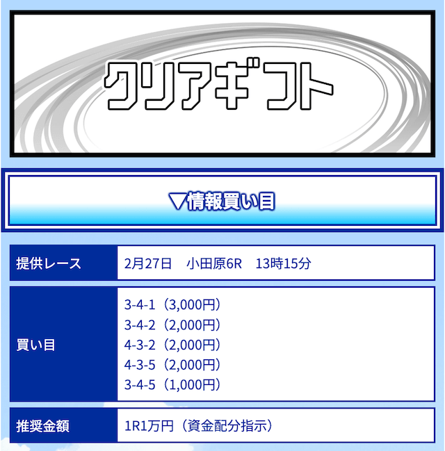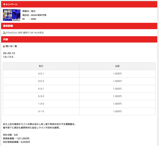 無料予想・有料予想同様に5点という少点数での買い目を公開しています。無駄な買い目を徹底的に省くことで回収率にも大いに期待できます。