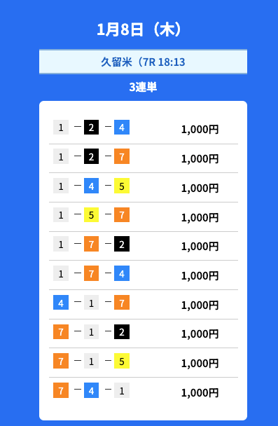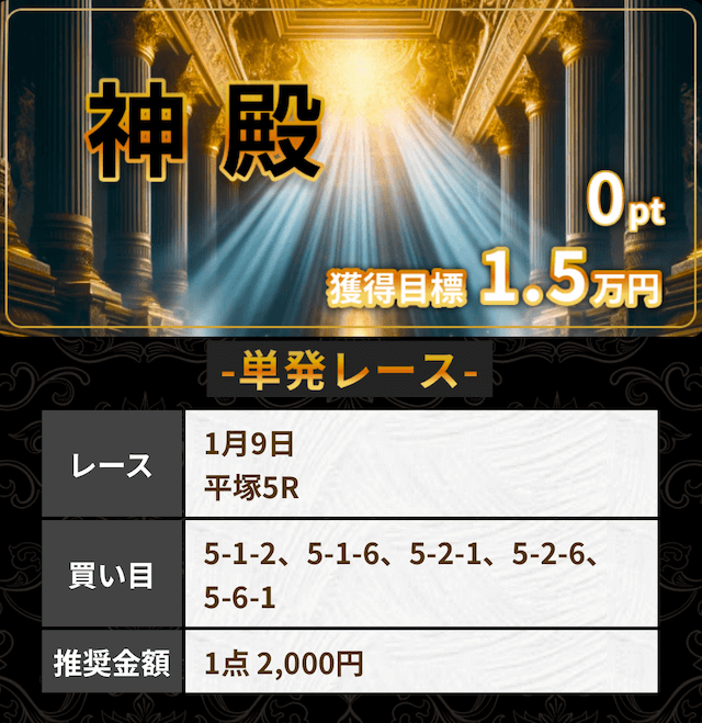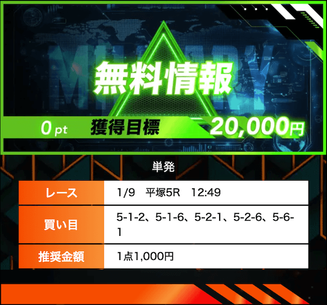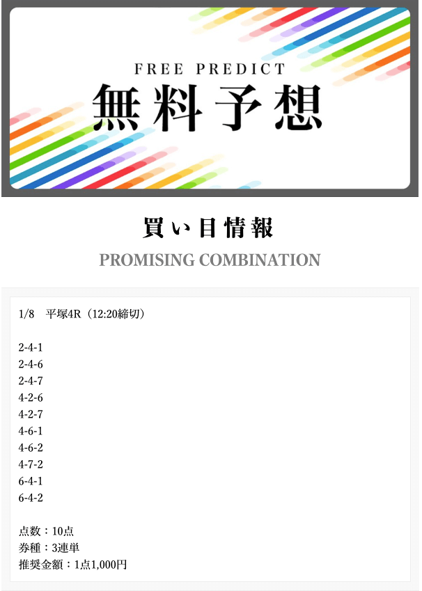 投稿者:ヨシズ5.0一番安いプラン「新兵」だと、登録特典のポイントを利用すれば無料で参加できました!記載されていた目標金額5万円には届きませんでしたが、久留米3Rに的中し、3万プラスの収支ゲットできました〜今後はより高いプランで、高配当を狙っていきます∠(`・ω・´)