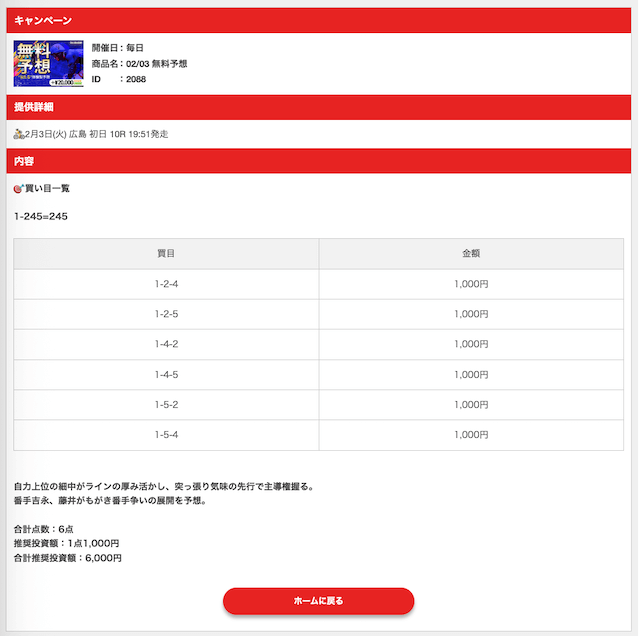 投稿者:Kim3.0無料予想目当てで登録しました。始めはメールアドレスとLINEの両方の登録で困惑しましたが、無事無料予想に参加することができました。結果は4戦3勝と期待以上の結果に。無料で稼げることは分かったので、始めの登録方法さえわかり易ければ完璧です!