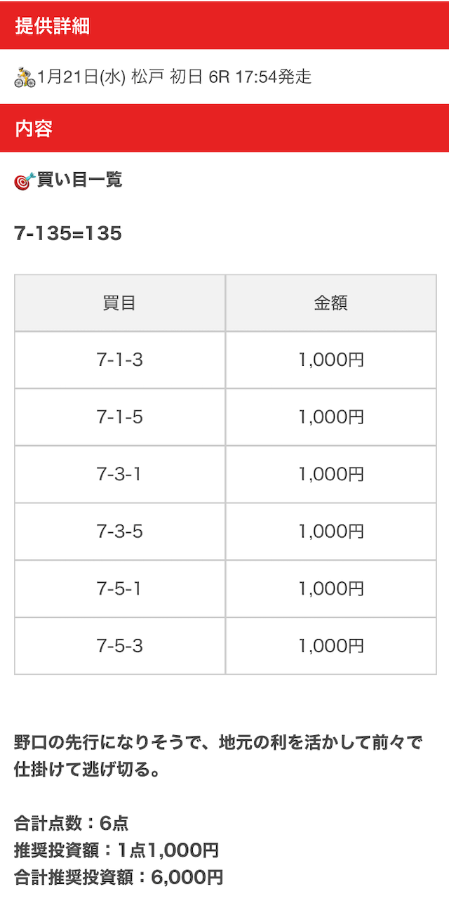 投稿者:寅之介5.0普段無料予想しかしませんが、このサイトの調子が良いので初めて有料予想にチャレンジしようと思います。有料プランの購入には疎いのですが、人気プランが分かりやすく表示されており、予想の見解もあるそう。無料予想で稼いだ資金を更に増やしてくれそうなので、安心できます。