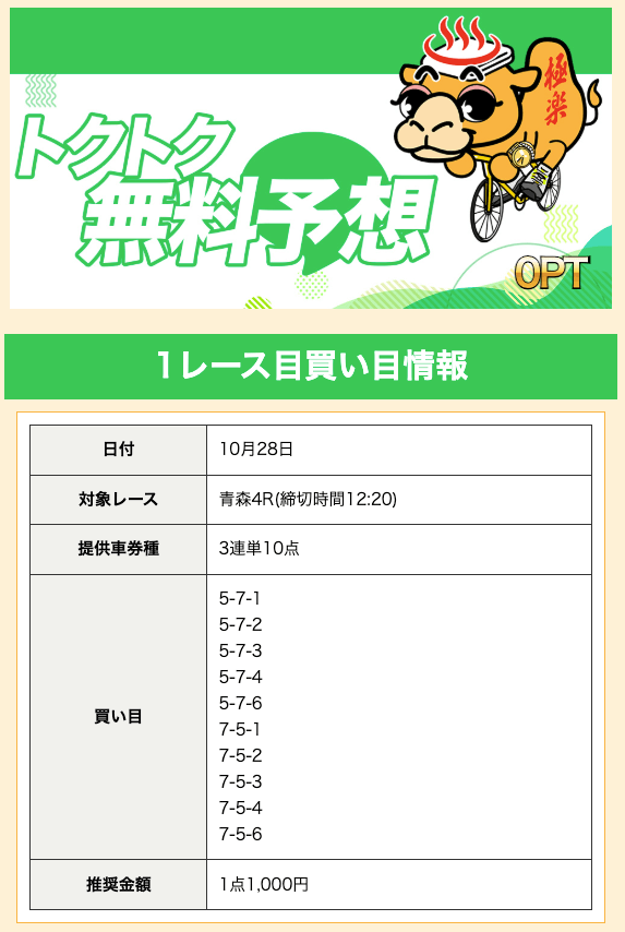 | 戦績 | 7戦6勝1敗 | 的中率 | 85.7% | 回収率 | 129.4% |