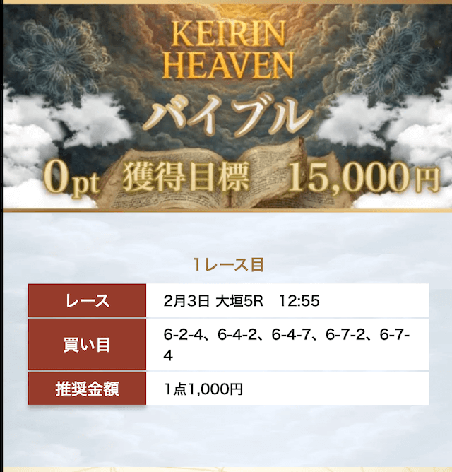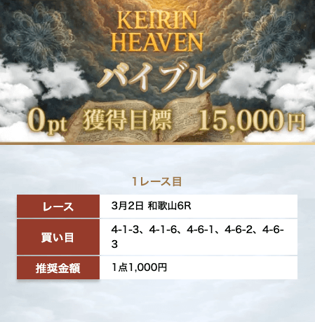 | マリア(DAY) | 40,000円 | 50万円 | 3連単 | 2レース | 5点(1点2,000円) |