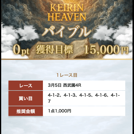 | ラファエル(NIGHT) | 120,000円 | 120万円 | 3連単 | 2レース | 5点(1点2,000円) |