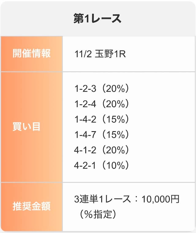 | 戦績 | 5戦4勝1敗 | 的中率 | 80% | 回収率 | 194.8% |