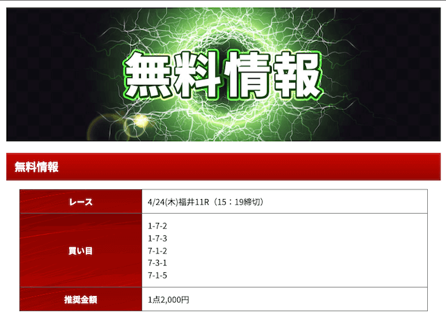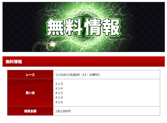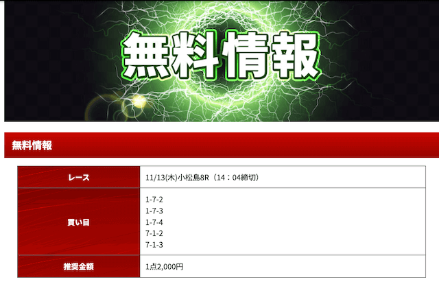 | 戦績 | 5戦3勝2敗 | 的中率 | 60% | 回収率 | 247.6% |