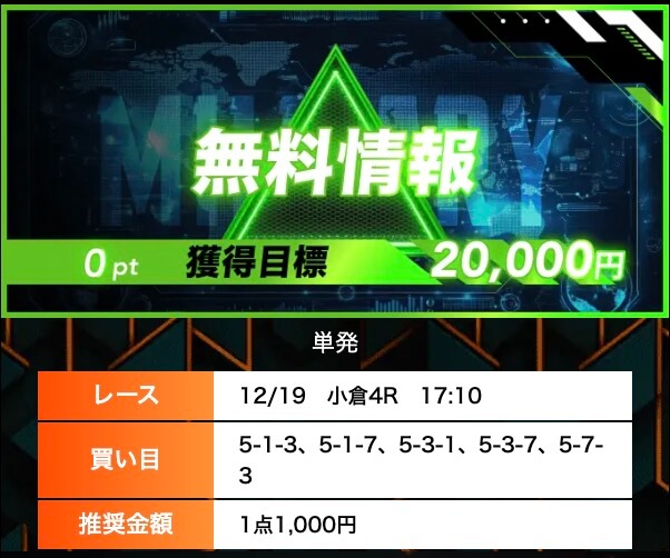 一番安いプラン「新兵」だと、登録特典のポイントを利用すれば無料で参加できました!記載されていた目標金額5万円には届きませんでしたが、久留米3Rに的中し、3万プラスの収支ゲットできました〜今後はより高いプランで、高配当を狙っていきます∠(`・ω・´)