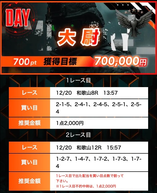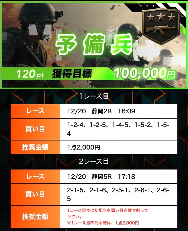 今回は最もリーズナブルなプラン「新兵」に参加されたようですが、見事的中を収めたとのこと。