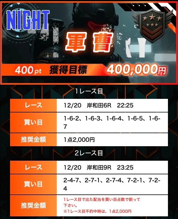 LINE登録特典の1万円ポイントを使って「新兵」プランに参加できたのが嬉しい。初心者だから有料は迷ってたけど、特典でお得に試せるのは大きいです。久留米のレースで3万円プラスになったし信頼できそう。
