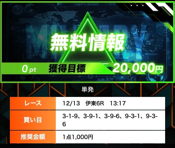 | 戦績 | 7戦5勝2敗 | 的中率 | 71.4% | 回収率 | 218% |