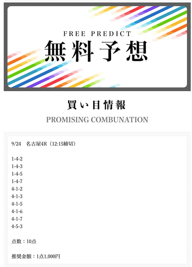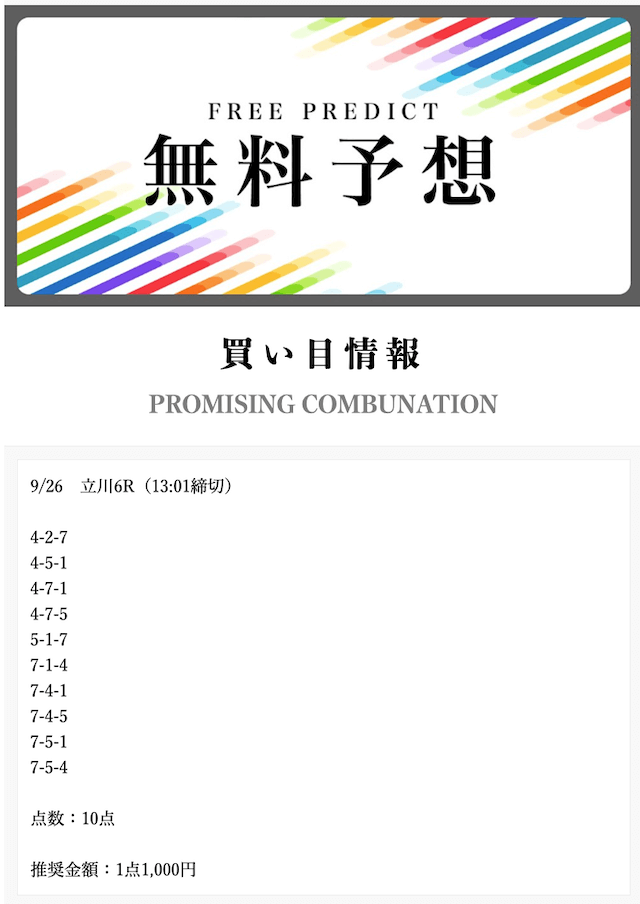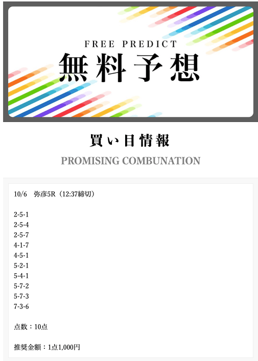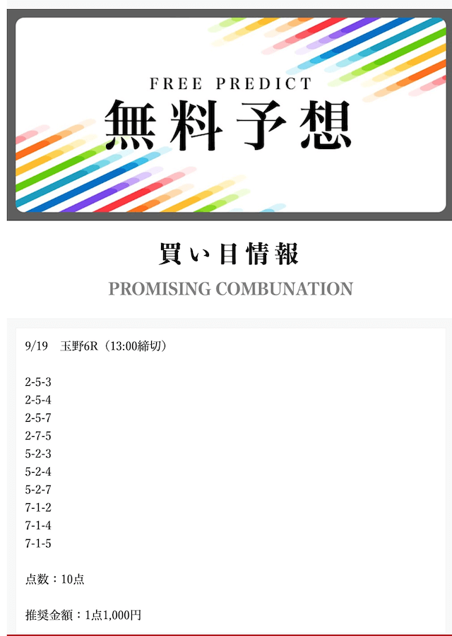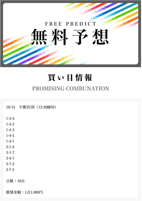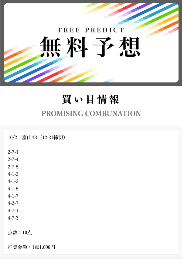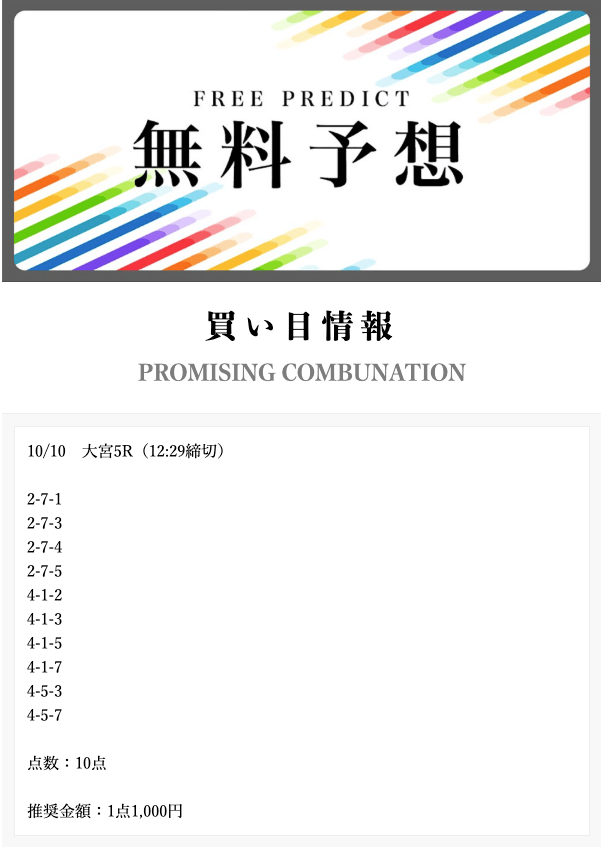 | 戦績 | 10戦8勝2敗 | 的中率 | 80% | 回収率 | 257.7% |