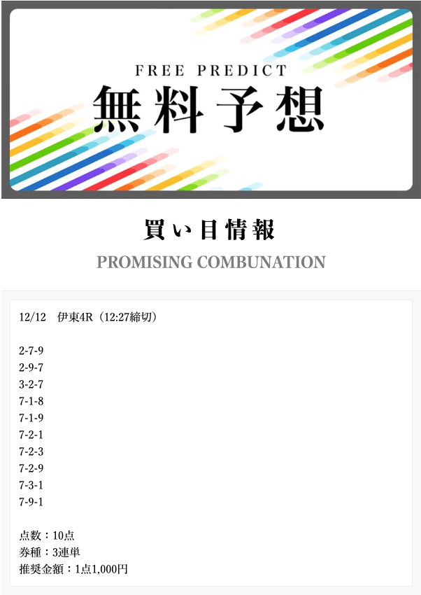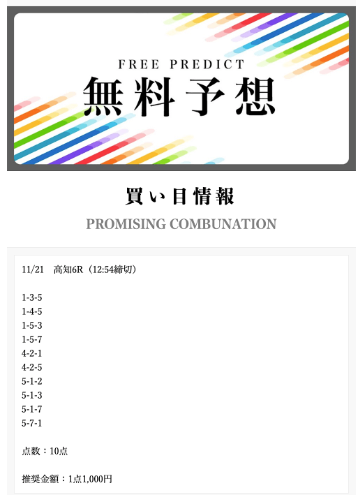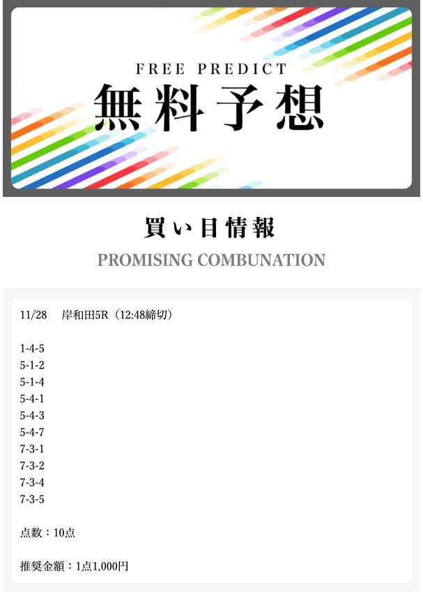 | 戦績 | 11戦8勝3敗 | 的中率 | 72.7% | 回収率 | 234.3% |
