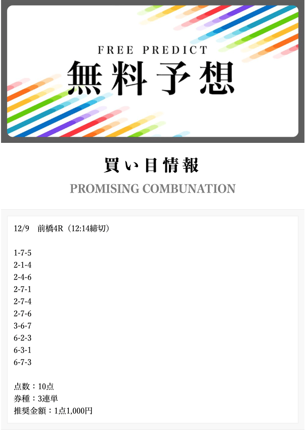 | 戦績 | 5戦4勝1敗 | 的中率 | 80% | 回収率 | 246.4% |