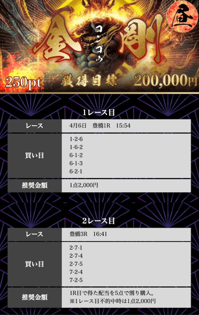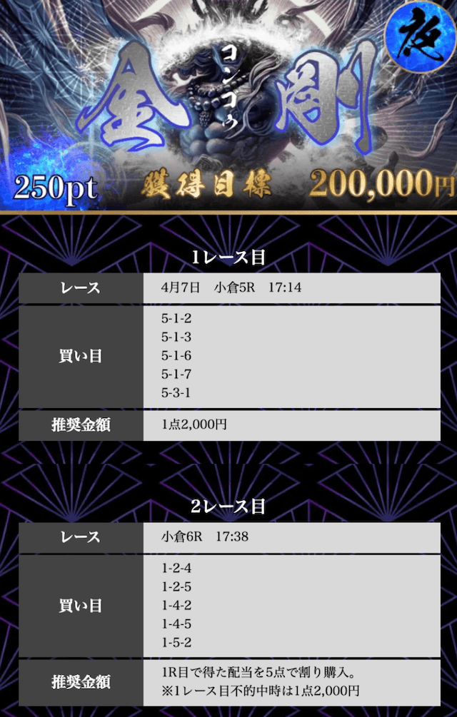 | 【金剛】-コンゴウ- | 25,000円 | 20万円 | 3連単 | 2レース | 5点(1点2,000円) |