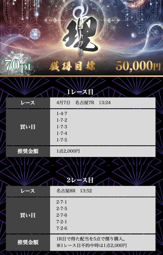 | 【理】-コトワリ- | 7,000円 | 5万円 | 3連単 | 2レース | 5点(1点2,000円) |