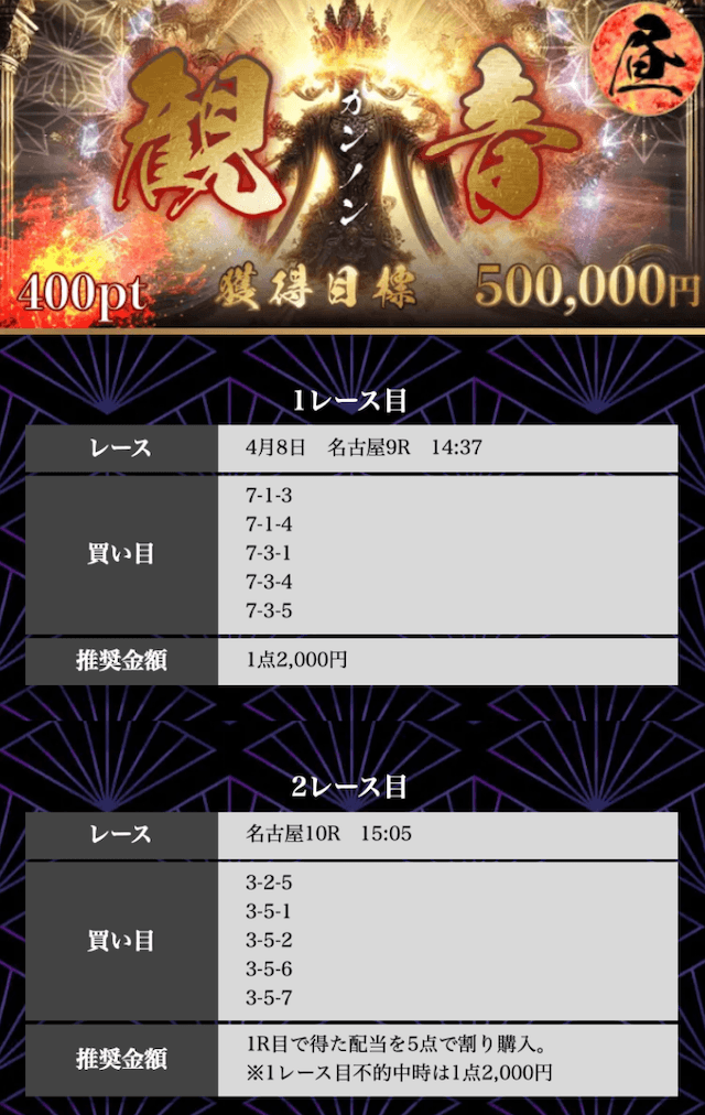 | 【観音】-カンノン- | 40,000円 | 50万円 | 3連単 | 2レース | 5点(1点2,000円) |