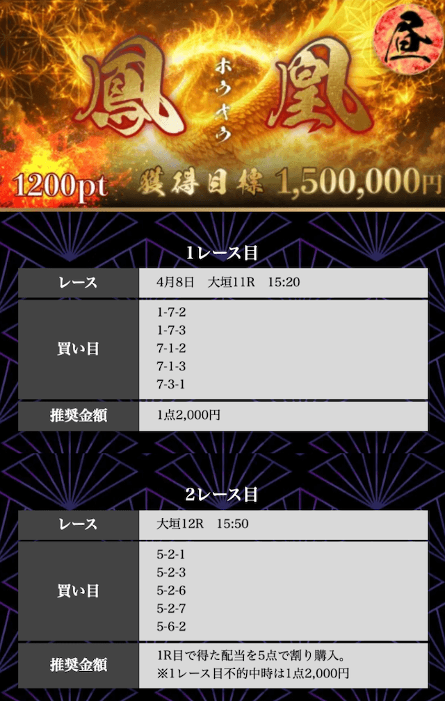 | 【鳳凰】-ホウオウ- | 120,000円 | 120万円 | 3連単 | 2レース | 5点(1点2,000円) |
