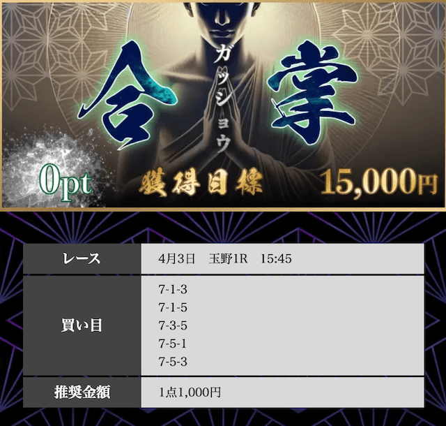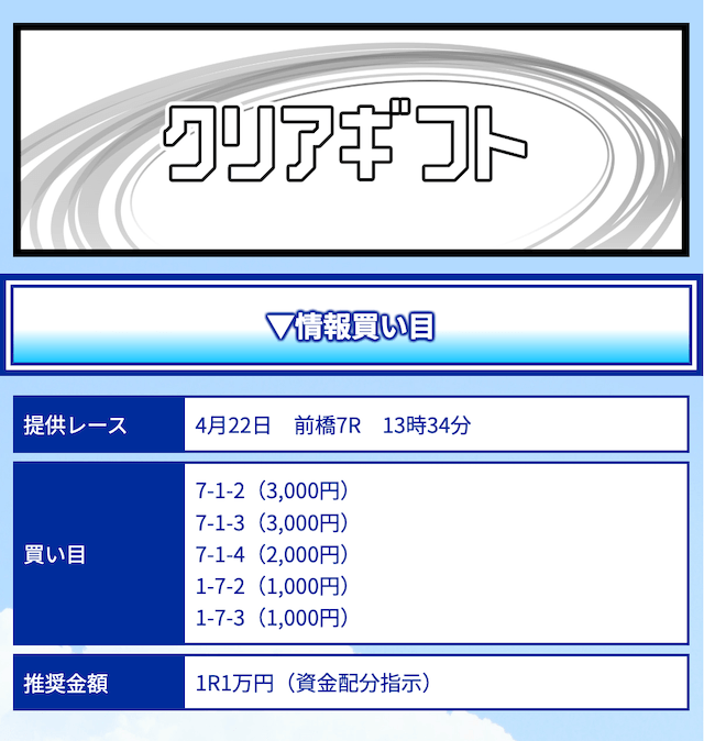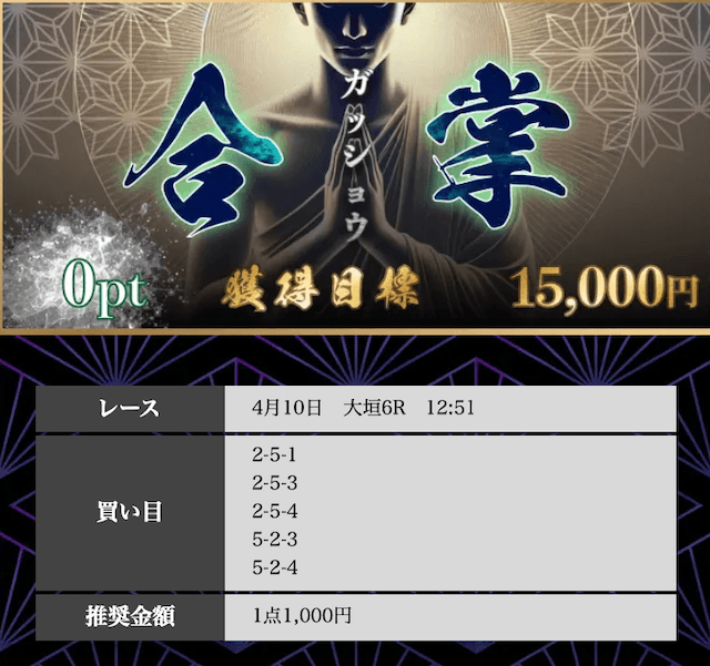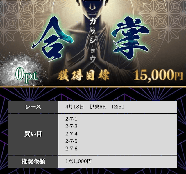 | 戦績 | 19戦12勝7敗 | 的中率 | 63.2% | 回収率 | 208.4% |