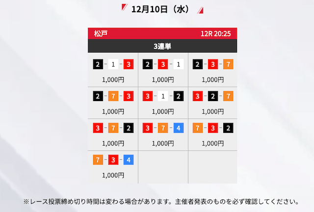 | 戦績 | 13戦11勝2敗 | 的中率 | 84.6% | 回収率 | 187.5% |