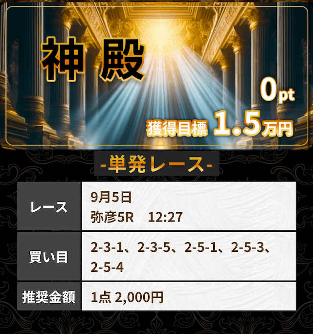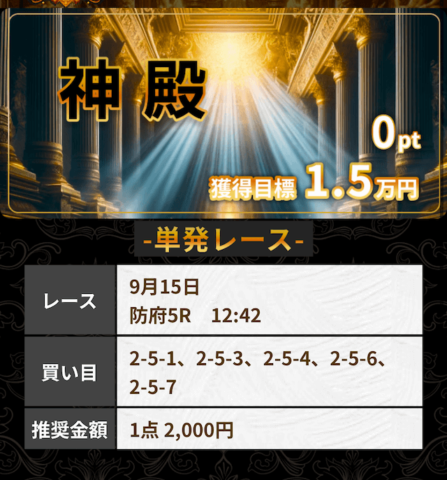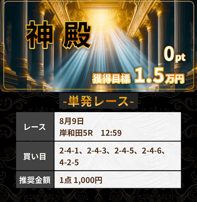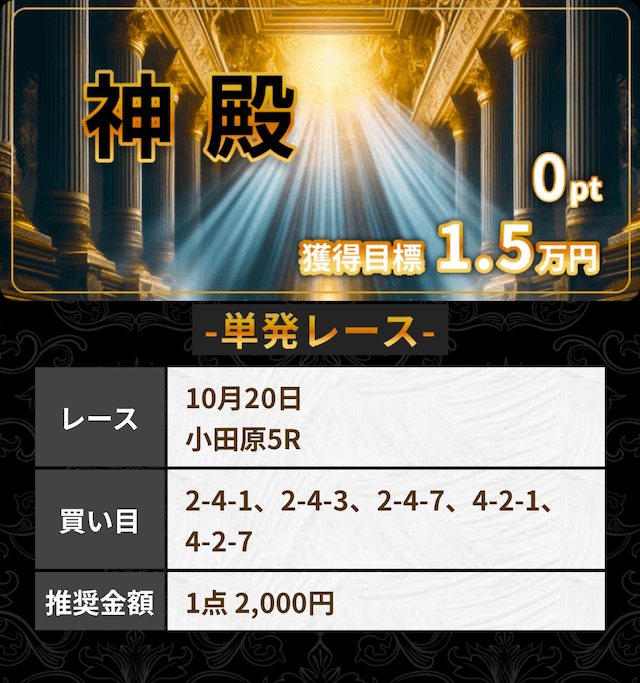 | 戦績 | 9戦7勝2敗 | 的中率 | 77.8% | 回収率 | 226.7% |