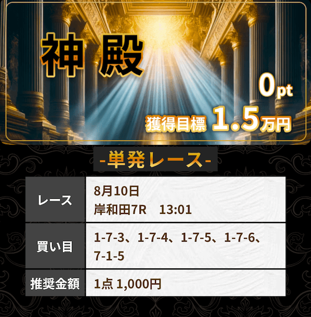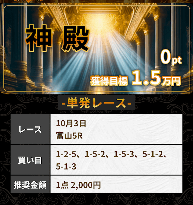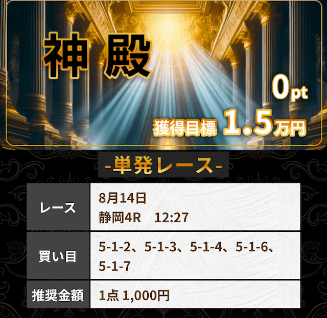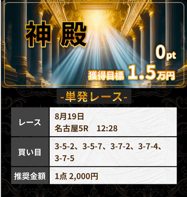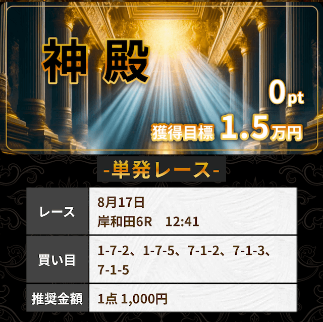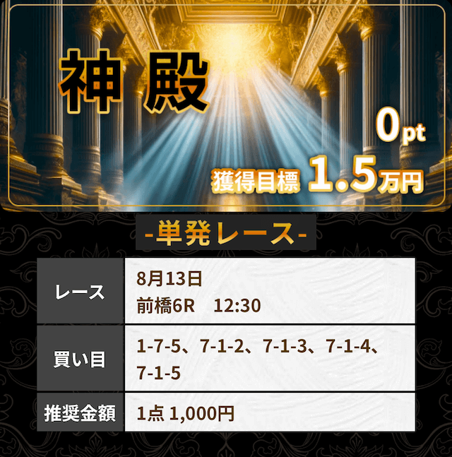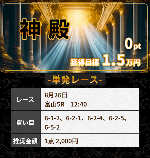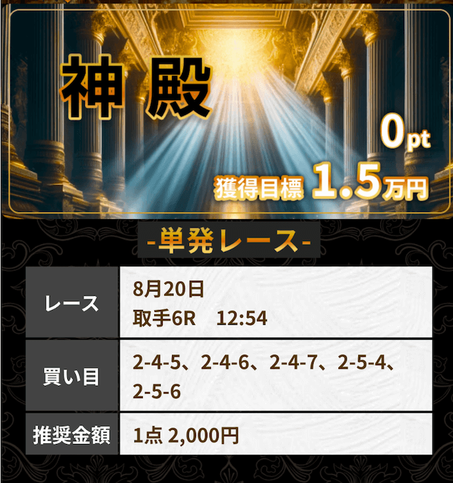 | 戦績 | 6戦5勝1敗 | 的中率 | 83.3% | 回収率 | 133% |