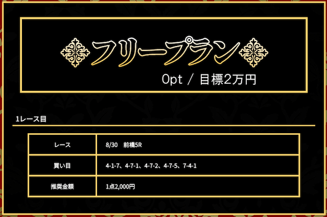 | 戦績 | 5戦4勝1敗 | 的中率 | 80% | 回収率 | 204.4% |