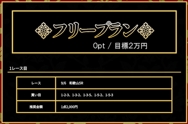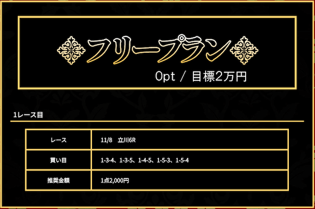 | 戦績 | 13戦11勝2敗 | 的中率 | 84.6% | 回収率 | 153.7% |