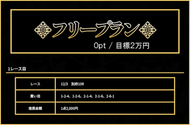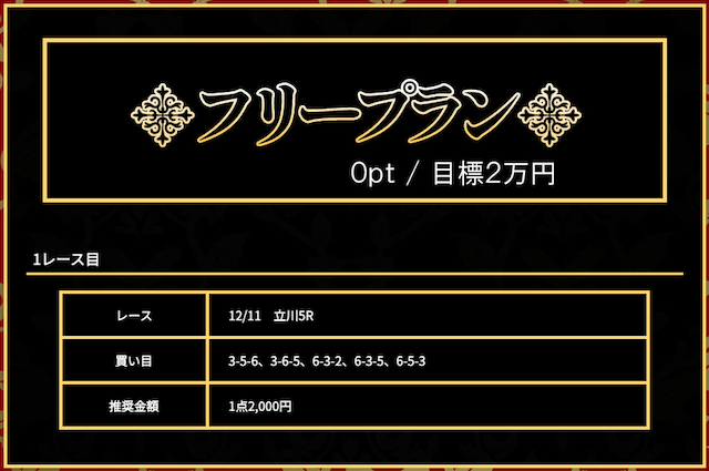 | 戦績 | 12戦10勝2敗 | 的中率 | 83.3% | 回収率 | 264% |