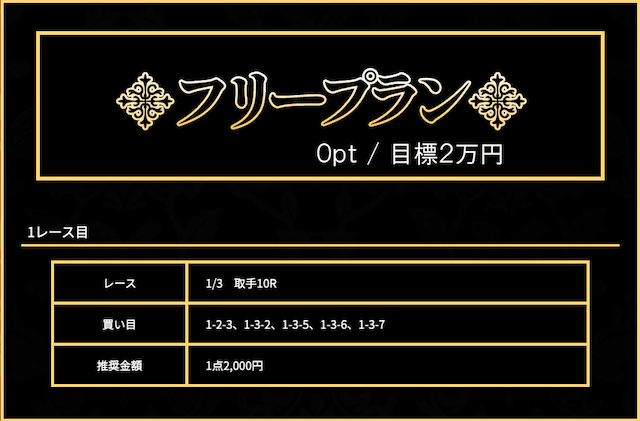 | 戦績 | 13戦10勝3敗 | 的中率 | 76.9% | 回収率 | 128.6% |