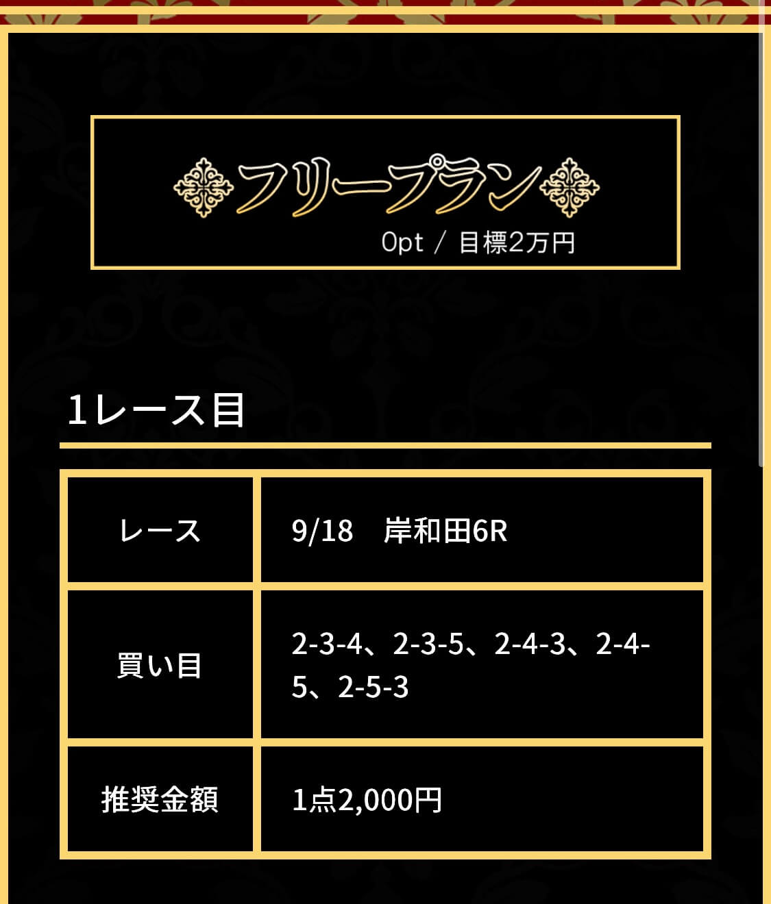 戦績 | 12戦10勝2敗 | 的中率 | 83.3% | 回収率 | 264% |