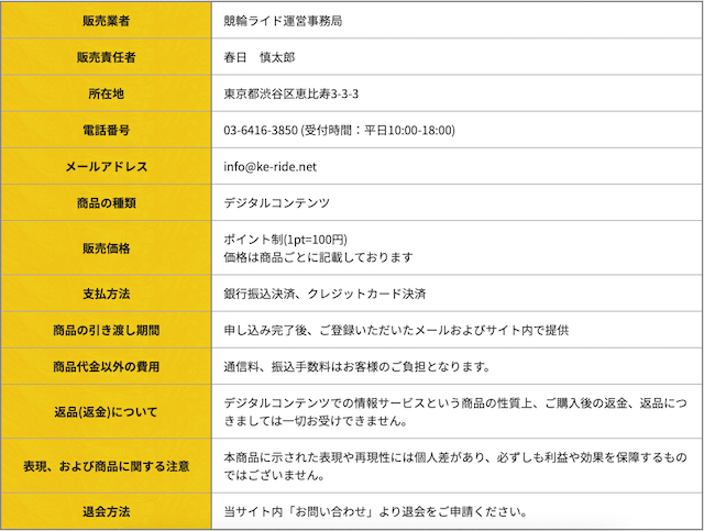 競輪ライドのように有料情報の販売を行っているサイトには特定商取引法に基づく表記が記載されています。