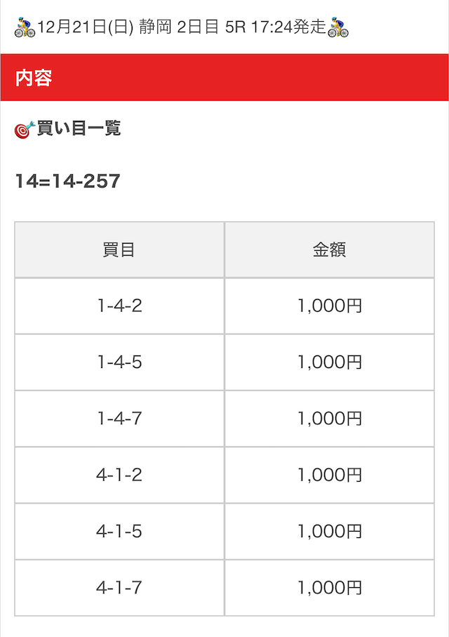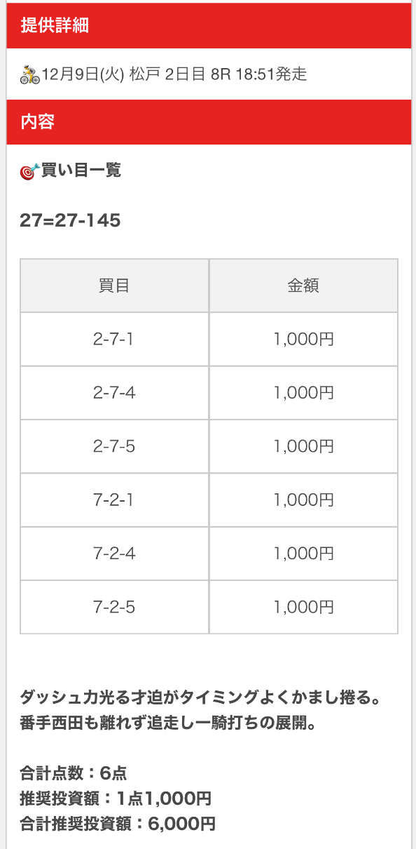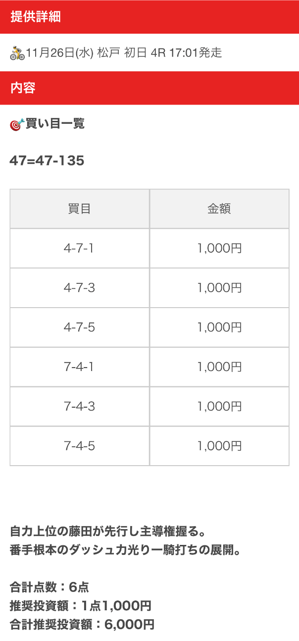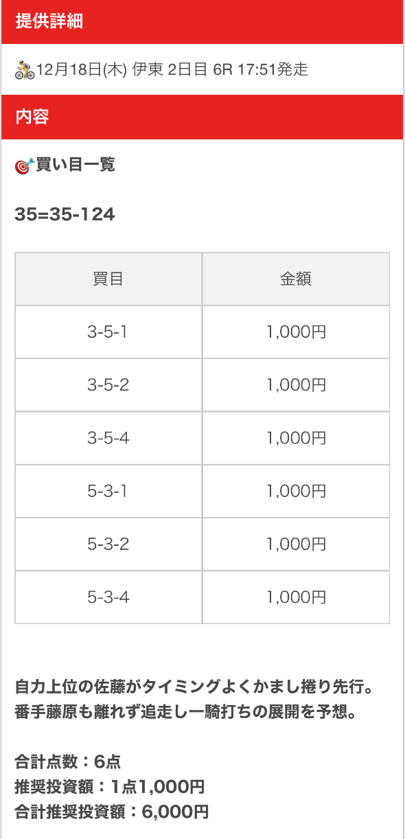 | 戦績 | 6戦5勝1敗 | 的中率 | 83.3% | 回収率 | 173.3% |