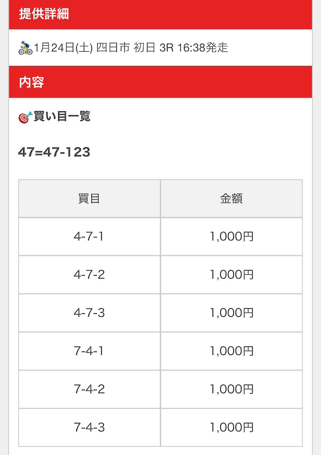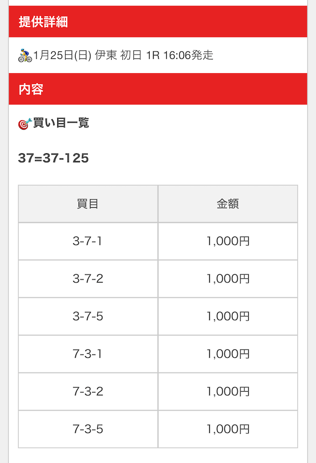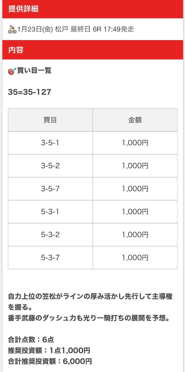 | 戦績 | 6戦6勝0敗 | 的中率 | 100% | 回収率 | 462.5% |